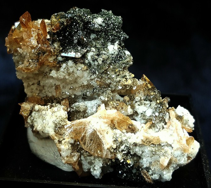 G2-A-12c: Sphen - Periklin - Chlorit - Stufe / Hohe Fürleg / Habachtal / auf einem Rasen von kleinen weißen Periklinen sint einige teils klare und hochglänzende Sphen-Kristalle bis ca. 8 mm gewachsen / dazu gehört etwas Chlorit / in Döschen aufgekittet / Größe: ca. 45 x 27 x 10 mm / Gewicht: 9 g / 24,00 €