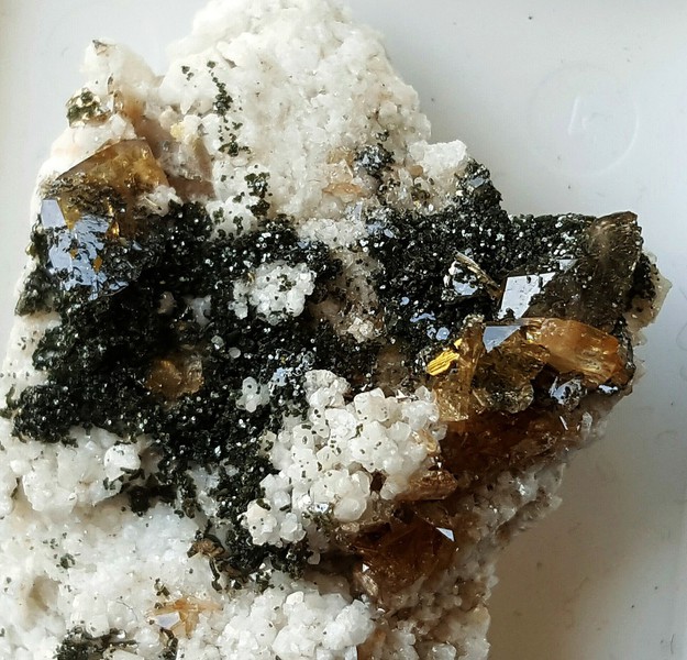 Auf heller Gneismatrix und Periklin-Rasen sind auf einer Seite einige gelb-orange Sphen-Kristalle gewachsen. Sie messen bis ca. 3 mm und sind recht klar und glänzend. Dazu gehören wenige Epidote bis ca. 3 mm. Auch auf der Rückseite sitzt Epidot. Gewicht: 66 g.