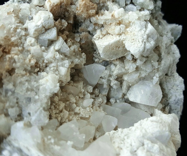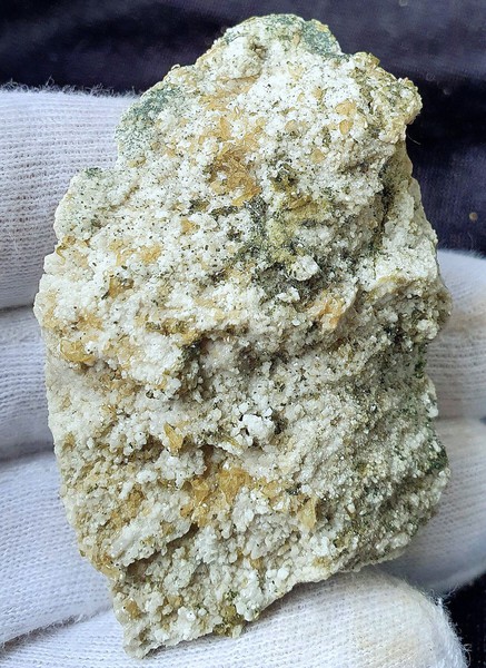 Auf ausgelaugtem Gneis sind auf einer Seite viele schneeweiße Periklin-Kristalle bis ca. 25 mm gewachsen. Dazwischen sitzen wenige dünntafelige Apatite bis ca. 5 mm. Dazu gehören Partien mit etwas Chlorit sowie in Kavernen des Gneises einige kleine Sphene um 1 - 2 mm. Gewicht: 444 g.