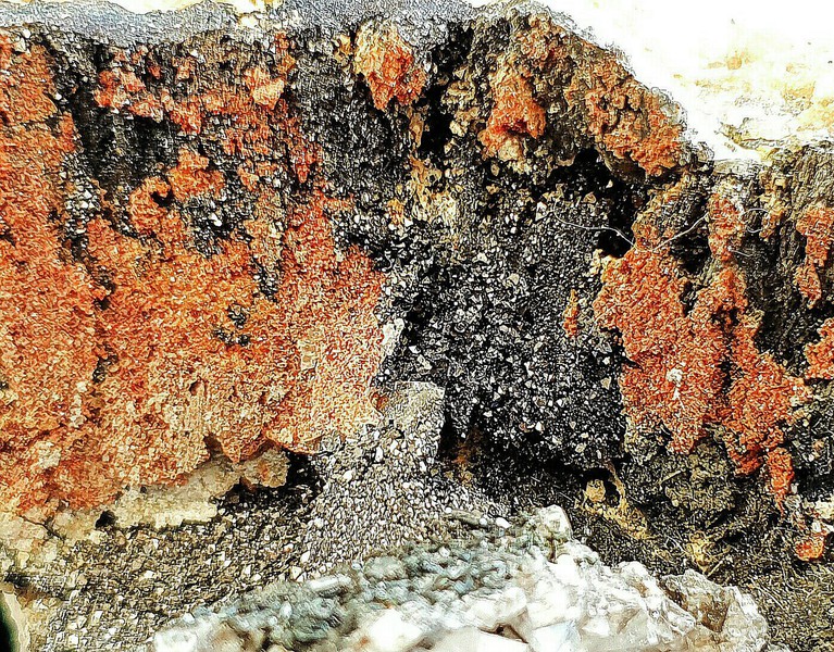 Auf einem Rasen winziger Adulare sind auf zwei Seiten der Stufe größere Partien mit Hämatit bewachsen. Dieser ist in unzähligen kleinen Plättchen um 1 - 2 mm ausgebildet. Sie zeigen oft Endflächen und hohen metallischen Glanz. Gewicht: 414 g.