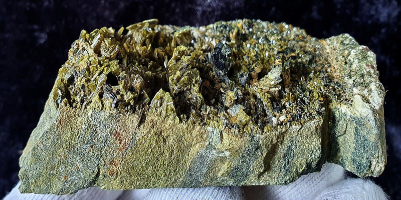Auf Grüngestein-Matrix sind rasenartig viele grüne Epidot-Kristalle bis ca. 10 mm gewachsen. Dazu gehören mehrere blockige Augit-Kristalle bis ca. 10 mm sowie wenig Albit. Die Stufe ist an der Unterseite geschnitten. Gewicht: 225 g.