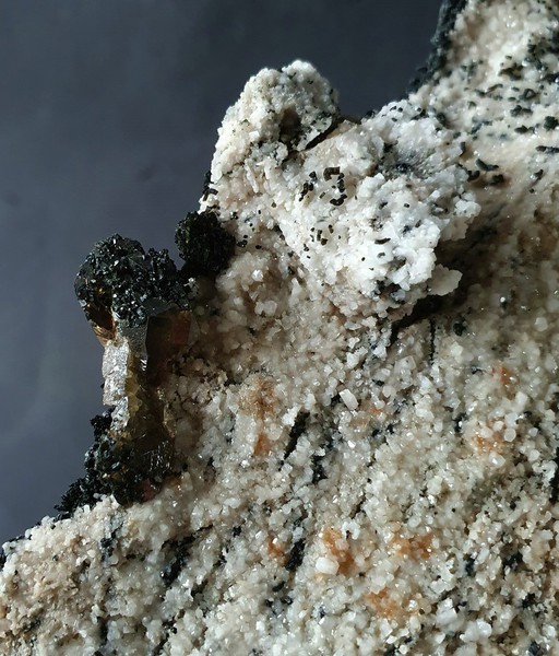 Auf Feldspat-Matrix sind einige scharfkantige Adulare bis ca. 12 mm gewachsen. In einer Kaverne der Stufe gibt es sehr viele hochglänzende Magnetit-Kristalle bis 1 mm, die schillenden Metallglanz zeigen. dazu gehört noch etwas Turmalin (Schörl). Gewicht: 258 g.