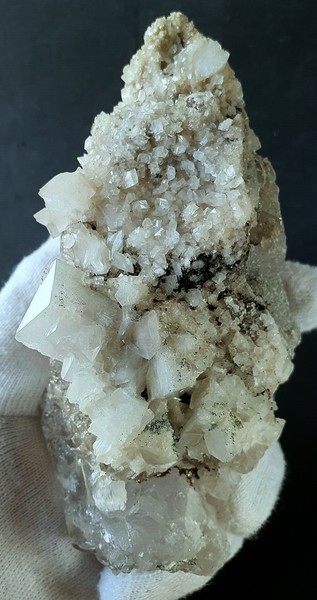 Dien Stufe trägt einige matt glänzende Calcit-Kristalle bis ca. 30 mm. Diese zeigen Kanten zonaren Wachstums und sind teilweise mit einem Rasen winziger klarer Bergkristalle um 1 mm bewachsen. Gewicht: 110 g.