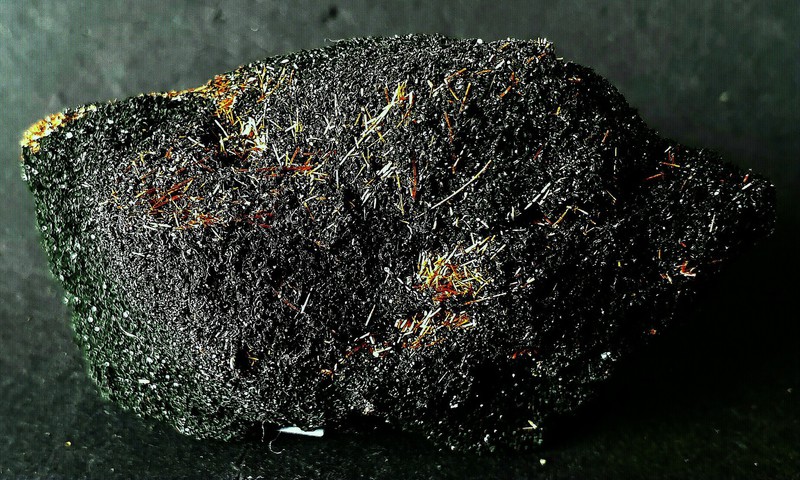 In schwärzlichem Chlorit eingewachsen sind rundherum sehr viele nadelige Rutil-Kristalle bis ca. 10 mm. Diese zeigen eine intensiv rot-goldene Farbe und hohen Glanz. Die Stufe ist in einem Döschen aufgekittet. Gesamtgewicht: 18 g.