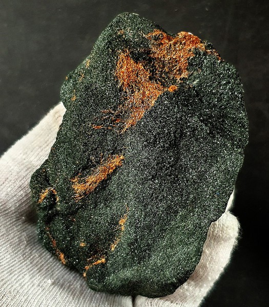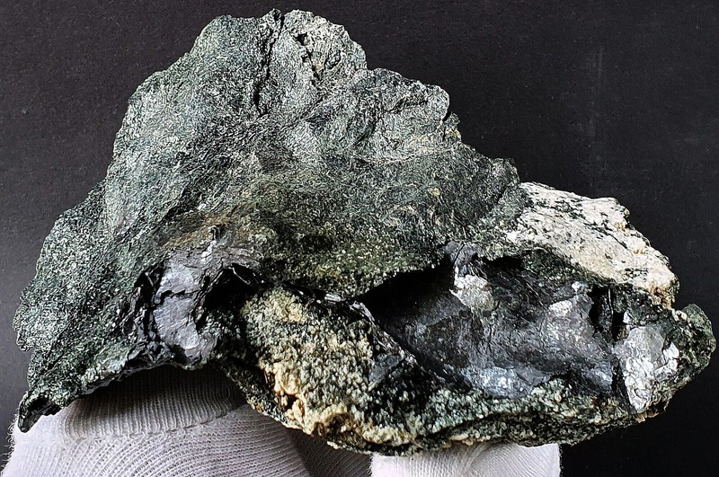 Auf typischen Grüngestein sind einige glänzende blockige Augit-Kristalle bis ca. 8 mm sowie einige Epidote bis ca. 9 mm gewachsen. Dazu gehört etwas feinnadeliger Byssolith und ein ca. 2 mm großer Apatit. Gewicht: 134 g.