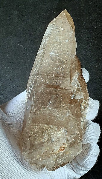 Dieser helle Rauchquarz zeigt rundherum Kristallflächen, ist teilweise gestuft gewachsen mit ausgeprägter Querstreifung. Die ehemalige Anwachsstelle ist rekristallisiert mit vielen kleinen Spitzen von hohem Glanz. Teilweise zeigt der Kristall natürliche Anlösungsstrukturen. Gewicht: 594 g.