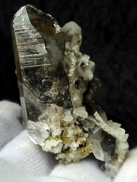 Auf Quarz-Feldspat-Matrix sind einige gestaffelte und glänzende Rauchquarze bis ca. 30 mm gewachsen. Die Spitzen sind teils etwas abgesplittert (siehe Bilder). Dazu gehört in schönem Kontrast ein Rasen weißer Adulare. Gewicht: 89 g.