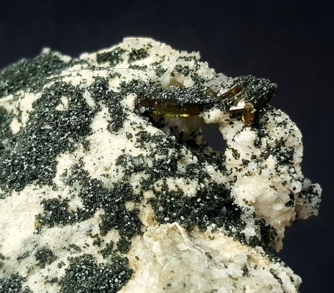 Zwei Seiten der Stufe sind dicht bewachsen mit reichlich schwärzlichen Diopsid(Augit)- und grünen Epidot-Kristallen bis ca. 3 mm. Dazu gehören einige kleine weiße Albite sowie Beläge von hellem Byssolith. Gewicht: 167 g.