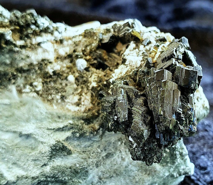 Auf stark gefalteter Grüngesteinsmatrix sind einige Aggregate von Tönnchen förmigen Diopsid (Augit)-Kristallen gewachsen. Diese zeigen oft Endflächen und messen 6 mm. Dazwischen sitzen einige Epidot-Kristalle und weiße Epitaxien aus Adular und Albit. Außerdem gibt es filzige Partien von Byssolith. Gewicht: 205 g.