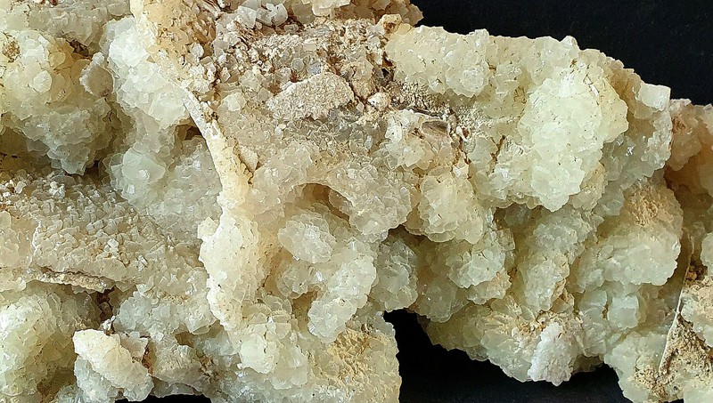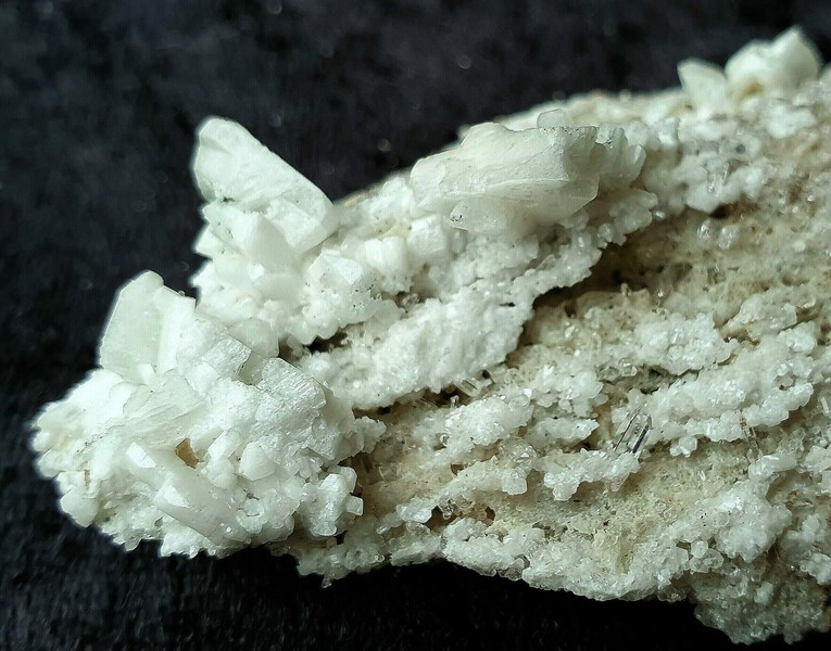 Die Stufe besteht fast ganz aus vielen weißen und scharfkantigen Adularen bis ca. 20 mm. Größere Partien der Adulare sind mit wirrstrahlig aufgewachsenen und hochglänzenden Laumontit-Kristallen bewachsen. Dazu gehört in Kavernen der Stufe etwas angelöster Bergkristall. Die Stufe ist an einer Seite geschnitten. Gewicht: 125 g.