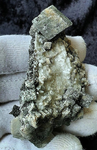 Diese Handstufe trägt auf mehreren Seiten schneeweiße Periklin-Kristalle bis ca. 12 mm. Sie sind etwas mit Chlorit belegt. Dazwischen sitzen mindetens 4 tafelige transparente Apatit-Kristalle bis ca. 8 mm (siehe Bilder 3 und 4). In Kavernen der Stufe gibt es wenige Sphene bis ca. 3 mm. Gewicht: 453 g.