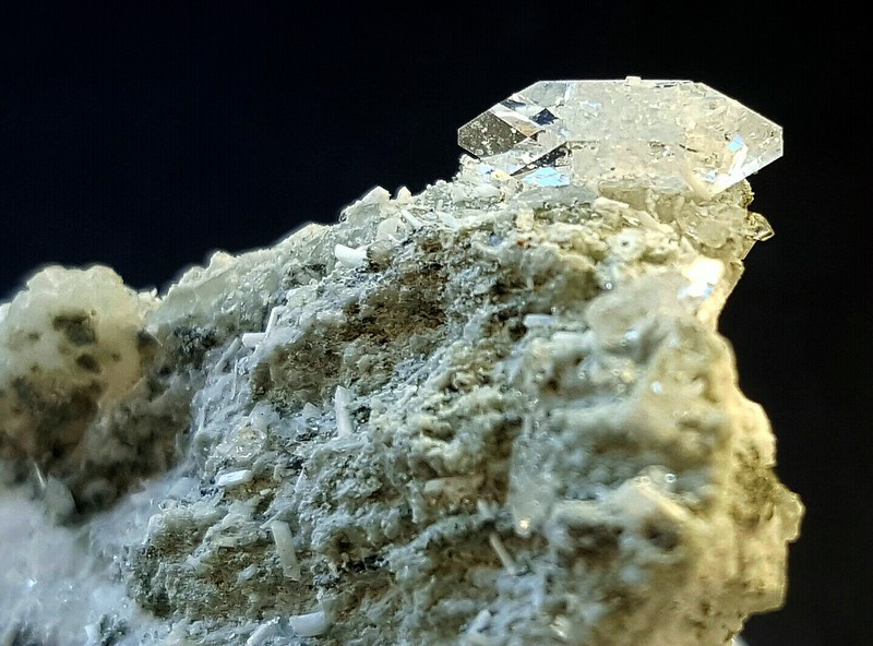 Auf ausgelaugter Gneis-Matrix sind v.a. auf einer Seite einige weiße Perikline bis ca. 4 mm, wenige Bergkristalle bis ca. 5 mm, einige Muskowite, sowie wenig Sphen gewachsen. Der größte Sphen misst ca. 4 mm, ist klar und intensiv orange farbig. Dazu gibt es rundum sehr viele hellgrüne Epidotnadeln um 2 mm. Gewicht: 55 g.