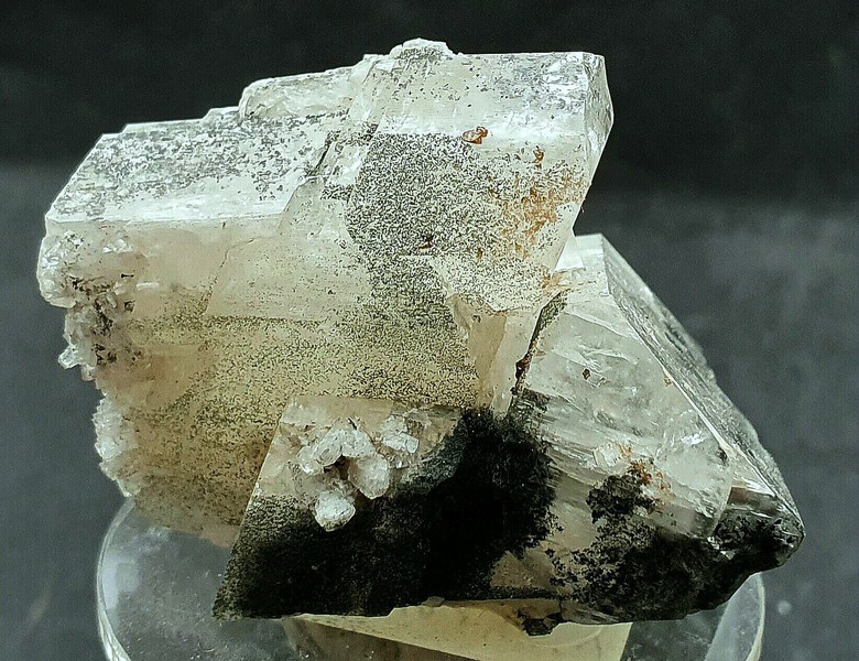 Die Stufe trägt einige transparente bis weiße und scharfkantige Adular-Kristalle. Sie sind mehrfach verzwillingt und messen bis ca. 30 mm. Dazu gehören auf einem Rasen winziger Adular immer wieder sehr kleine limonitisierte Pyrit-Kristalle und etwas Chlorit. Gewicht: 110 g.