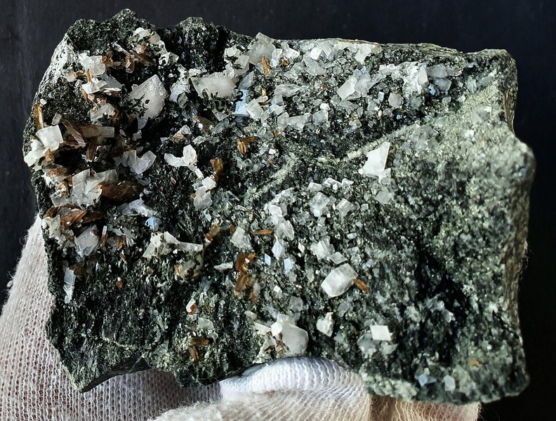 Eine Seite der Amphibolith-Matrix ist bewachsen mit einigen scharfkantigen und klaren Sphen-Kristallen bis ca. 12 mm. Sie zeigen eine braun-grüne Farbe und guten Glanz. In schönem Kontrast dazu sitzen weiße Adulare bis ca. 10 mm auf der Stufe. Die Matrix ist an mehreren Seiten geschnitten. Gewicht: 435 g.
