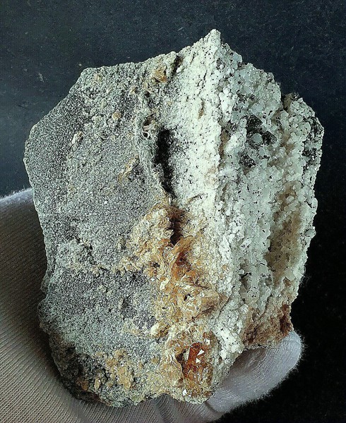 Auf Gneis-Matrix sind auf zwei Seiten der Stufe etliche orange-braune Sphene bis ca. 8 mm gewachsen. Sie zeigen teils hohen Glanz und gute Klarheit. Dazu gehören viele weiße Perikline bis ca. 8 mm und etwas Chlorit. Gewicht: 537 g.