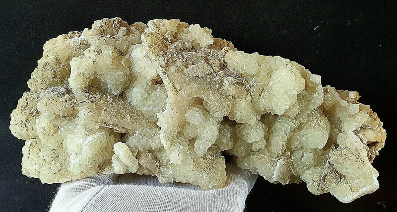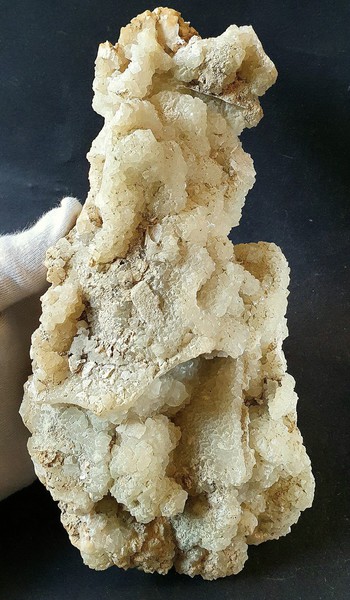 Die Stufe trägt rundherum, aber vor allem auf einer Seite sehr viele transparente Prehnit-Kristalle bis ca. 6 mm. Auf einer Seite der Stufe zeigen die Prehnite einige Negativ-Abdrücke von Kristallflächen ehemals aufgelöster Kristalle (wohl früher Calcite). Gewicht: 916 g.