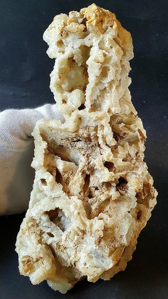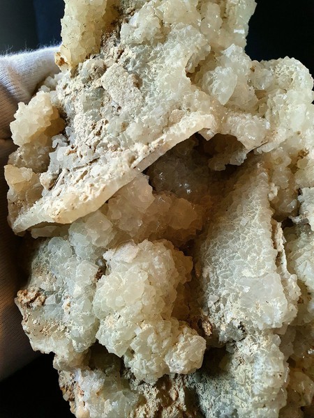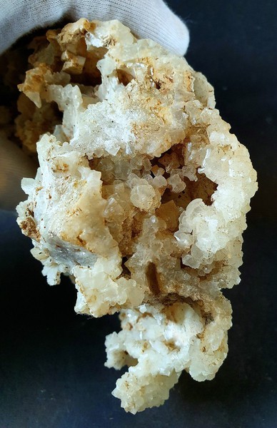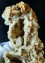 G2-B-20a: Auf ausgelaugtem und porigen Calcit sind einige klare Bergkristalle bis ca. 5 mm gewachsen Die schneeweißen Perikline messen bis ca. 12 mm. Es gibt an einer Stelle wenige kleine Sphene um 1 mm und wenig Muskowit. Größe: ca. 80 x 50 x 30 mm / Gewicht: 84 g / 12,00 €