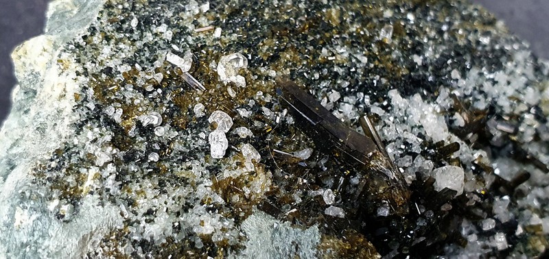 Eine Seite der Stufe ist besetzt mit reichlich nadeligem Schörl-Turmalin, der auf einem Rasen weißer kleiner Perikline sitzt. Dazwischen sind einige Sphene bis ca. 5 mm gewachsen. Gewicht: 284 g.