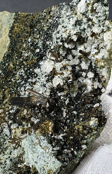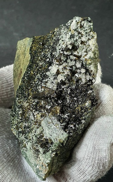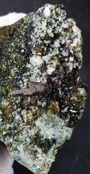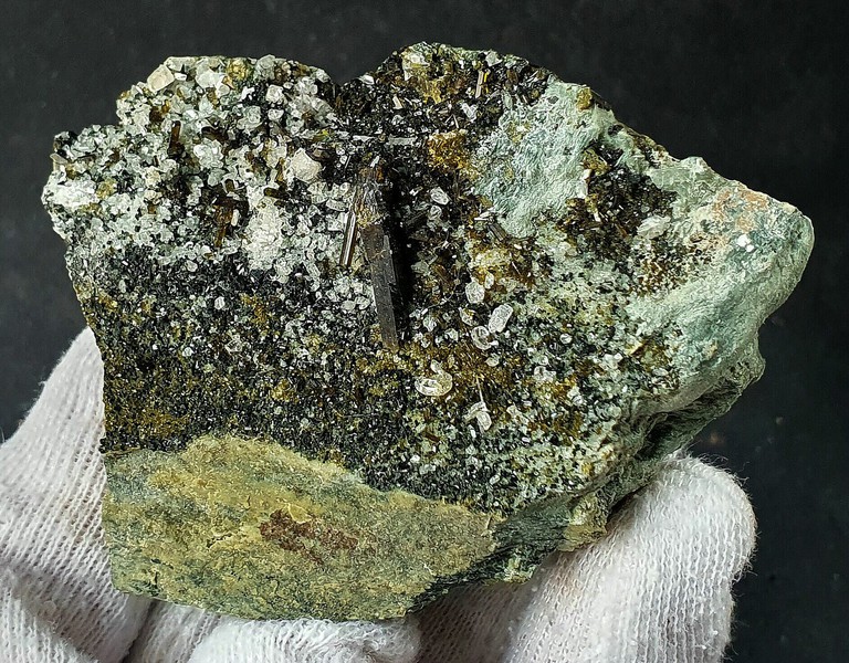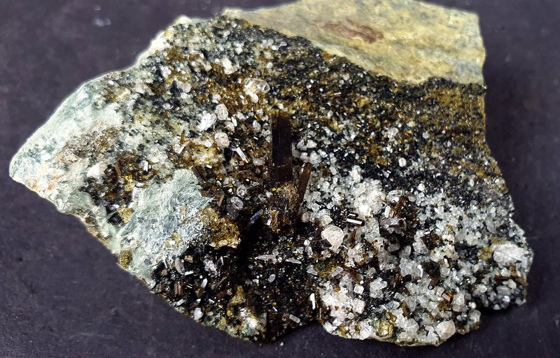 Diese Handstufe ist besetzt mit sehr vielen Tönnchen förmigen Augit-Kristallen bis ca. 6. Diese zeigen schwärzlichen Glanz und meist auch matte Endflächen. Dazwischen sitzen einige teils klare Epidot-Kristalle bis ca. 8 mm, teils mit Endflächen, teils als Aggregate. Im mittleren Bereich der Stufe gibt es ein Band aus reichlich weißen bis transparenten Albit-Kristallen um 4 -5 mm. Diese sind teils mit etwas Chlorit belegt. Die Stufe ist an der Unterseite geschnitten. Dazu gehört ein Sammlungs-Etikett von 1982. Gewicht: 842 g.
