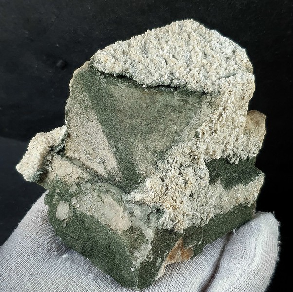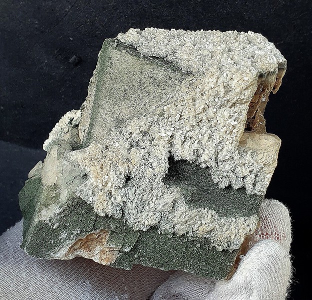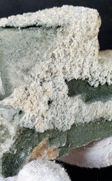Diese Stufe ist rundherum mit unzähligen winzigen Prehnit-Kristallen bewachsen. Diese sind oft chloritisiert oder in halbkugeligen Aggregaten formiert. Eine Partie der Stufe ist bewachsen mit Bergleder (Sepiolith), der filzige und plattige "Lappen" ausgebildet hat. Gewicht: 311 g.
