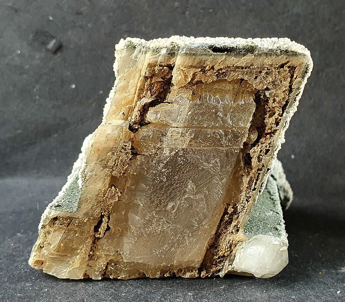 Der Calcit-Kristall zeigt abgestufte Kanten und ist durch Chlorit-Besatz weitgehend grün gefärbt. Darauf sitzen noch weitere kleine, transparente Calcit-Rhomboeder bis ca. 12 mm. Außerdem gibt es größere Partien, die mit vielen schneeweißen Laumontit-Kristallen übersät sind. Diese wurden nachträglich durch Auftragen von einer Art Lack stabilisiert und dadurch vor dem Zerfall geschützt. Eine Seite des Calcites ist natürlich angelöst (siehe Bild 6). Gewicht: 367 g.