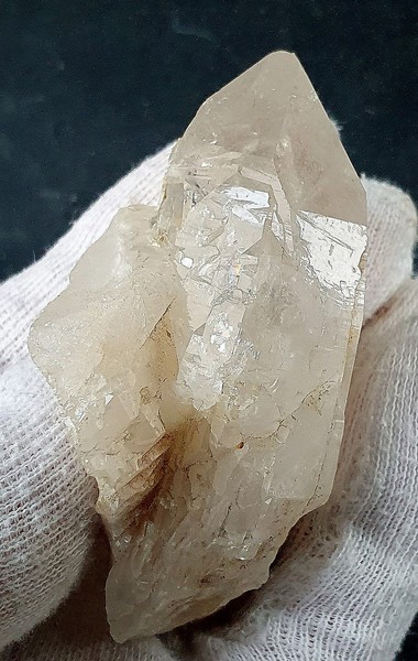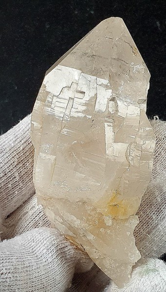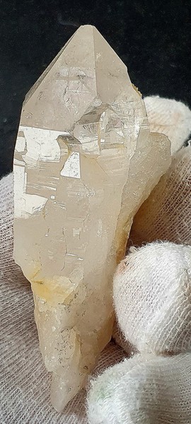 Der Bergkristall wird zur Spitze hin klarer und zeigt hohen Glanz. Es gibt manche rekristallisierte Fläche und auch Bruchstellen (siehe Bild 6). Gewicht: 103 g.