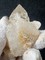 G3-A-3b: Zwei Seiten der massiven schiefrigen Matrix sind mit Kritallen bewachen. Eine Seite trägt ein Fadenquarz-Aggregat (siehe Bilder 2,4 und 6), weitere klare Quarze sowie viele gelbliche angelöste Calcit-Kristalle bis ca. 12 mm. Die andere Seite ist bedeckt mit oft flach verzerrten Bergkristallen bis ca. 30 mm und vielen Calciten bis ca. 10 mm, die oberflächlich mit dunkelbraunem Limonit bedeckt sind. Größe: ca. 170 x 90 x 80 mm / Gewicht: 1332 g / 42,00 €