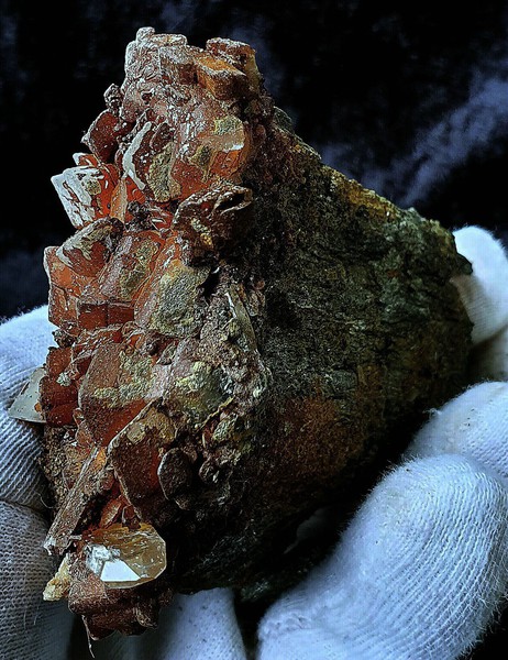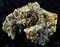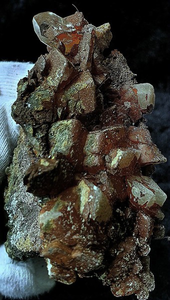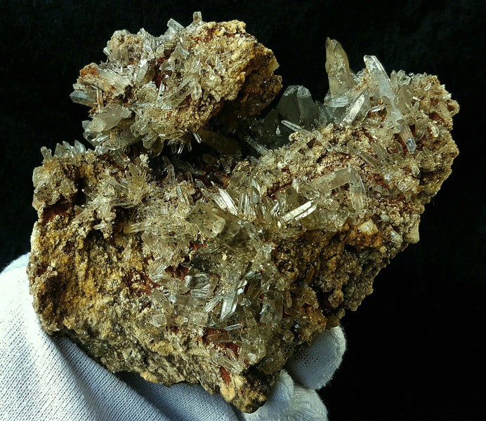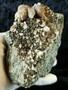 Auf dünner Gesteinsmatrix ist ein Rasen recht klarer Bergkristalle bis ca. 12 mm gewachsen. Darauf gibt es sechs halbkugelige Aggregate bis ca. 11 mm Durchmesser aus limonitisierten Siderit-Kristallen. auf einem davon sitzt ein kleiner Pyrit von 1,5 mm. Gewicht: 49 g.