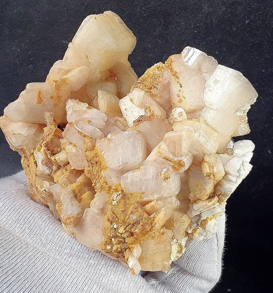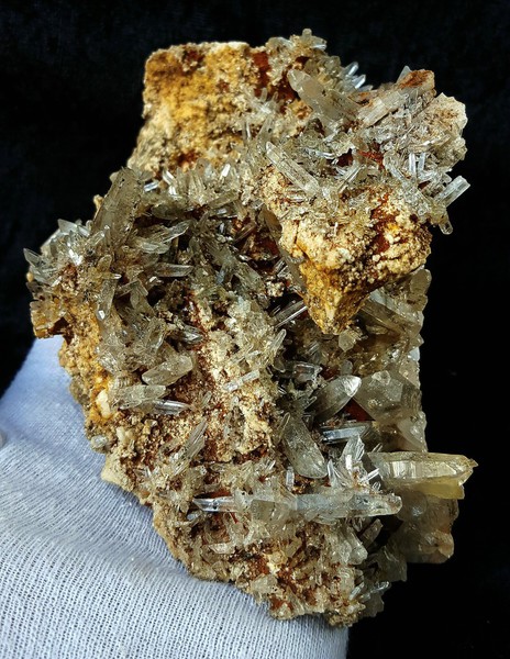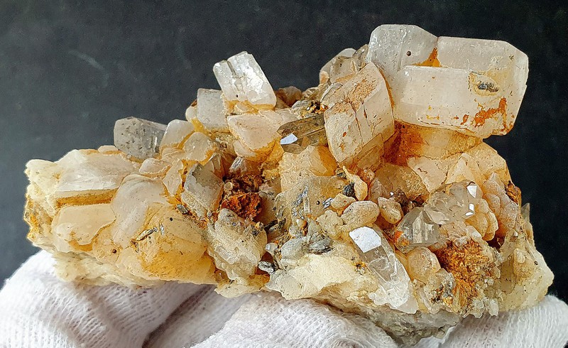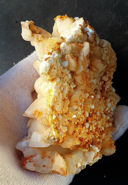 Die Stufe besteht aus mehreren, teils sehr klaren Spitzen mit hohem Glanz. Die Basis ist komplett rekristallisiert mit vielen kleinen Sitzchen sowie einigen Calciten bis ca. 10 mm. Teilweise der Quarz und vor allem die Calcite sind durch oberflächlichen Eisenhydroxid-Belag gelbfarbig. Eine Spitze ist etwas abgesplittert (siehe Bilder 4 und 5 oben). Gewicht: 248 g.