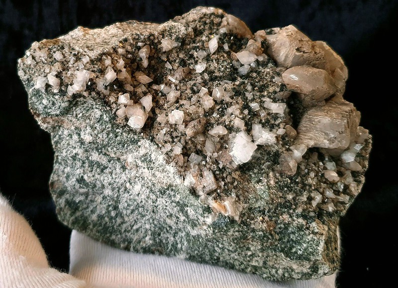 Auf größerer Gneis-Matrix sind auf einer Seite viele beige-Farbige und scharfkantige Adulare bis ca. 7 mm gewachsen. Dabei sind viele Klinochlor-Aggregate um 1 mm sowie einige kleine Bergkristalle gewachsen. Dazu gehört eine Gruppe von angelösten Calcit-Skalenoedern bis ca. 25 mm. Gewicht: 852 g.