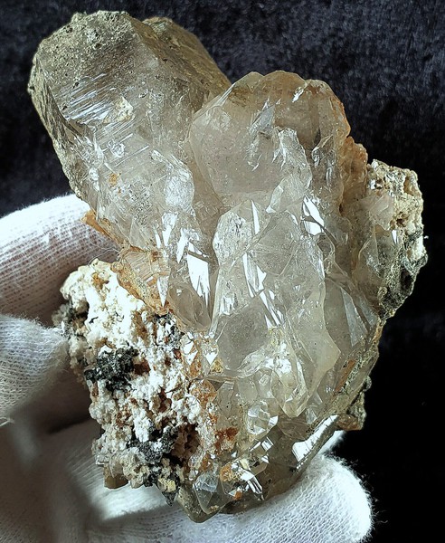 Auf wenig Quarz-Matrix sind einige milchig-weiße und auch klare Bergkristalle bis ca. 85 mm gewachsen. Teilweise sind sie durch Eisenhydroxid-Belag oberflächlich gelb farbig. Der größte Bergkristall ist ein Doppekender und hat an einer Spitze eine größere Absplitterung (siege Bild 1 oben). Gewicht: 255 g.