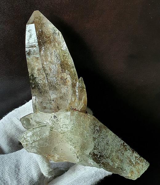 Die Stufe besteht aus zwei aneinander gewachsenen Bergkristallen, die jeweils ca. 100 mm lang sind. Der eine zeigt auf einigen Flächen hohen Glanz und ist im Innern recht klar.Außerdem gibt es mehrere Einschlüsse von Rutilen bis ca. 15 mm. Der andere Bergkristall weist mehrere Spitzen auf und ist durch ehemalige Brüche und Verheilungen gekrümmt ausgebildet. Einige Prismaflächen sind mit Chlorit belegt. Gewicht: 280 g.