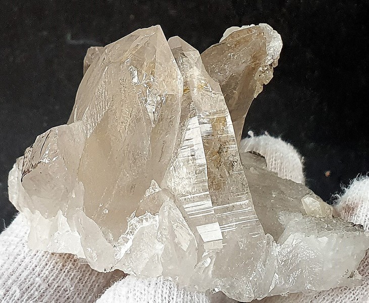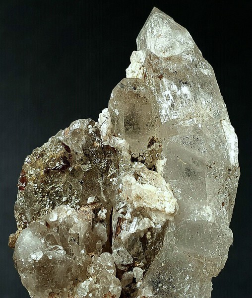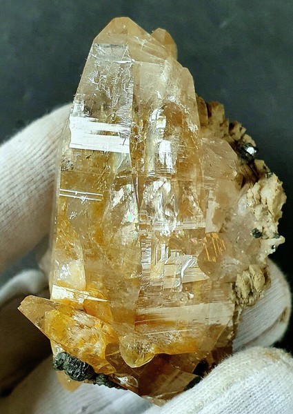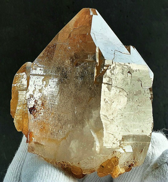 Der Bergkristall ist im steilrhombodrischen "Rauriser Habitus" ausgebildet und weist auf den Flächen durch leichte Anlösung ein damaszierendes Schillern auf. Es gibt verheilte Anwachserstellen und an der Spitze eine kleine Absplitterung (auf den Bildern nicht genau zu sehen). Gewicht: 178 g.