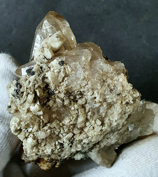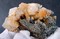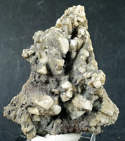 G3-B-13a: Die Stufe trägt viele weiß-transparente rhomboedrische Calcit-Kristalle bis ca. 20 mm Kantenlänge. Dazu hehören vor allem auf einer Seite porzellan-weiße Perikline bis ca. 12mm. Auf den Calciten sitzen noch viele etwas limonitisierte Dolomit-Kristalle um 1 - 2 mm. Größe: ca. 95 x 80 x 50 mm / Gewicht: 340 g / 32,00 €