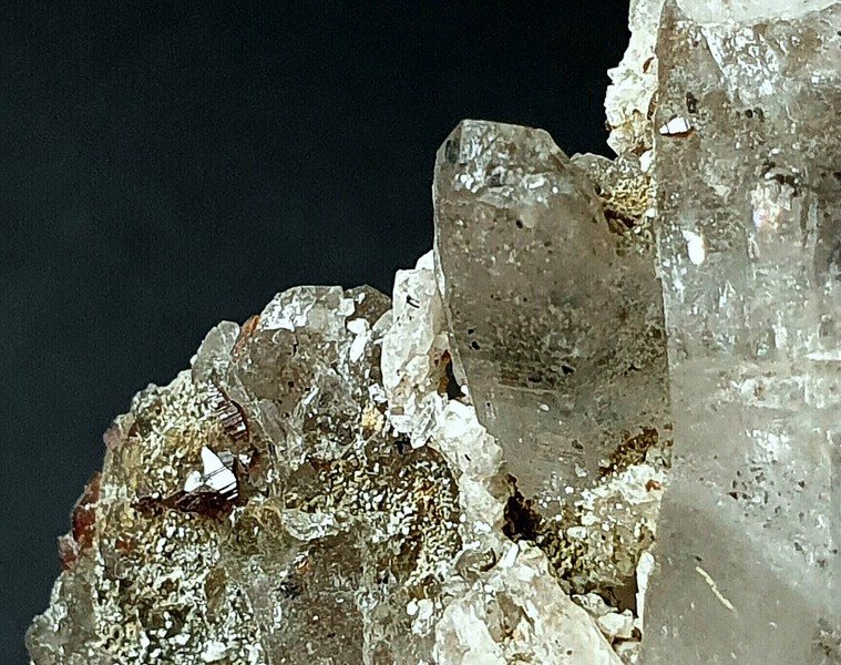 Teils sind die Bergkristalle und Calcite sind von unterschiedlich dunklem Limonit belegt. Andere Calcite sind transparent .