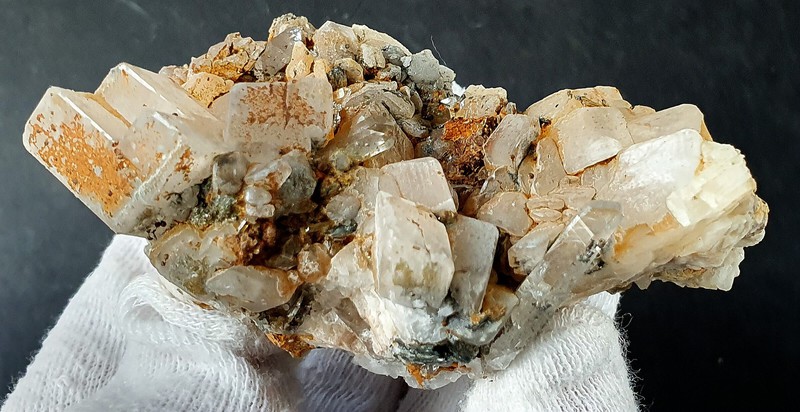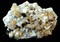 G3-B-1d: Rundherum viele schneeweiße Perikline bis ca. 14 mm / dazu etliche transparente Calcite bis ca. 10 mm / einige limonitisierte Aggregate von Siderit und ein kleiner Bergkristall / Größe: ca. 70 x 50 x 20 mm / Gewicht: 71 g / 14,00 €