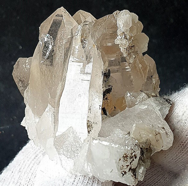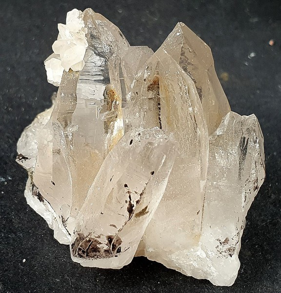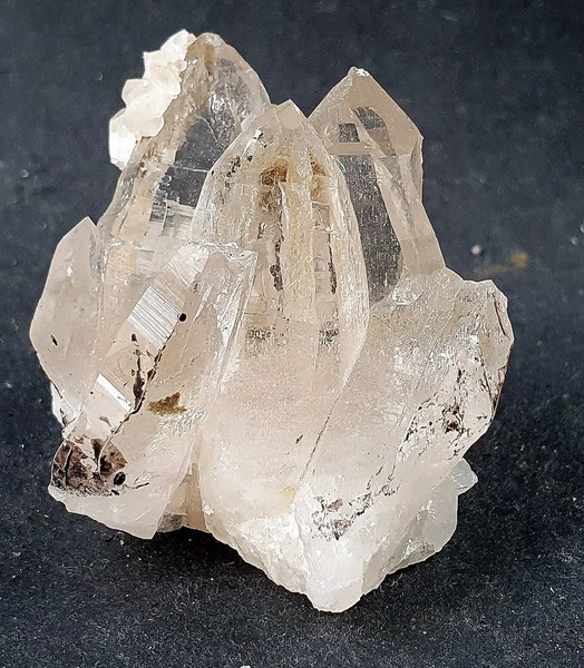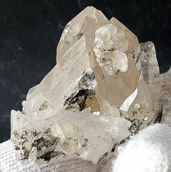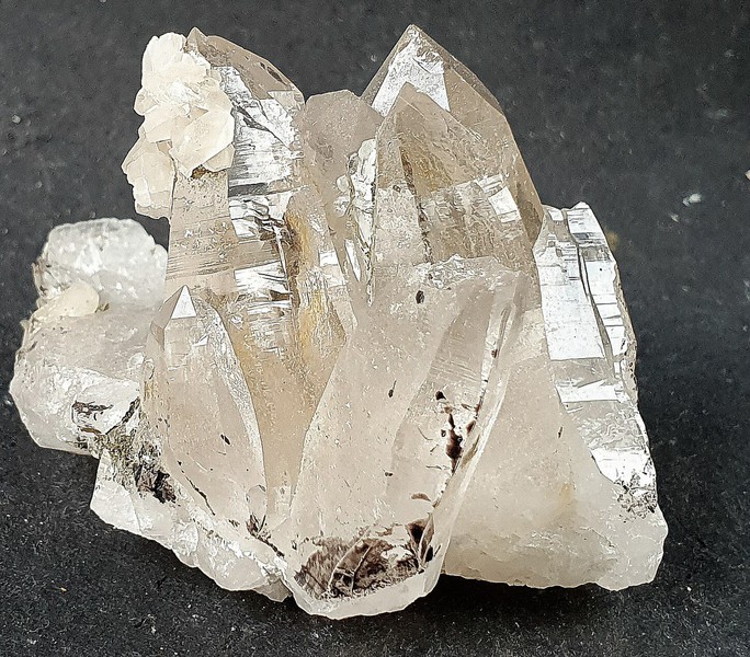 Die Stufe trägt auf Quarz-Matrix mehrere teils recht klare Bergkristalle bis ca. 40 mm. Auf einem der Quarze sitzt eine kleien Ansammlung von transparenten Calciten. Es gibt rekristallisierte Stellen. Ein Bergkristall ist abgebrochen. Gewicht: 88 g.