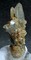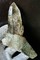 Der Kristall hat mehrere Spitzen ausgebildet sowie einige teils doppelendige Anwachser-Kristalle bis ca. 50 mm.Die Quarze habe durch feine Chlorit-Einschlüse eine grüne Farbe. Dazu gehören einige transparente Calcit-Kristalle bis ca. 10 mm. Gewicht mit Sockel: 42 g.
