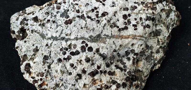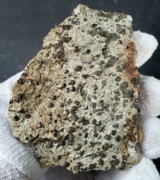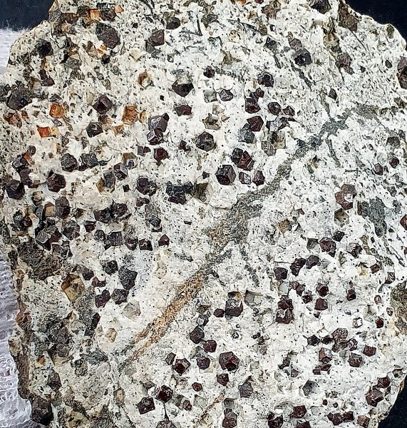 Die Stufe weist viele eingewachsene kleine Almandin-Kristalle um 2 mm auf. Auf einer Seite zeigen sie guten Glanz, auf der anderen Seite sind diese meist etwas verwittert. Gewicht: 88 g.