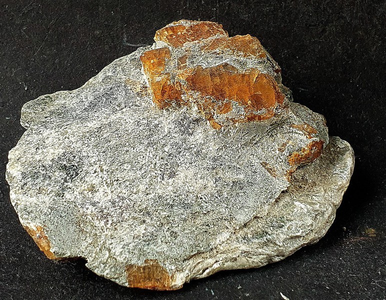 Aus quarzreichem Glimmerschiefer sitzen einige braun-rote Almandin-Granate bis ca. 20 mm Durchmesser. Sie zeigen meist hohen matten Glanz auf den glatten Flächen. Manche sind beschädigt. Gewicht: 773 g.