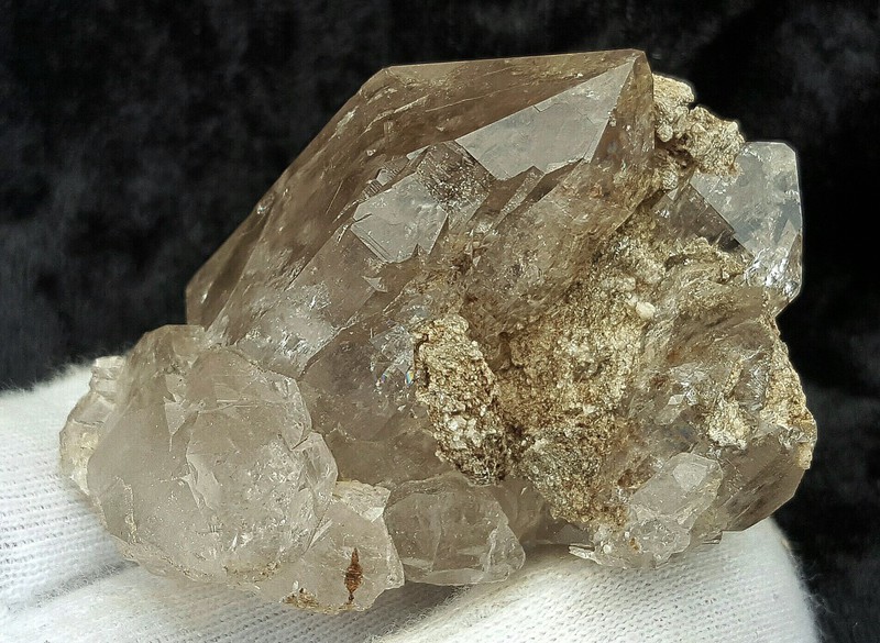 Die Stufe besteht aus einigen teils doppelendigen Bergkristallen bis ca. 75 mm. Der größte Bergkristall besteht aus zwei reihenverwachsenen und recht klaren Doppelendern mit minimalem Versatz der Spitzen. Jedoch kann das nicht als Gwindel bezeichnet werden. Es gibt an der Stufe verheilte Stellen und etwas Muttergestein. Gewicht: 270 g.