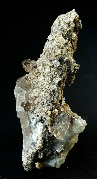 Eine Seite der Stufe ist bewachsen mit einigen Bergkristallen bis ca. 45 mm. Teils sind sie mit reichlich hochglänzenden Hämatit-Plättchen besetzt und durchwachsen. Dazu gehören an einer Stelle wenige transparente Albit-Kristalle bis ca. 6 mm. Gewicht: 506 g.