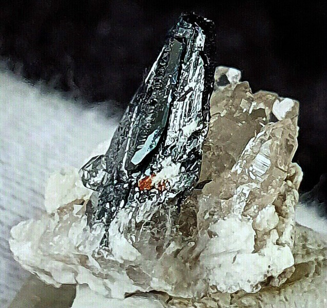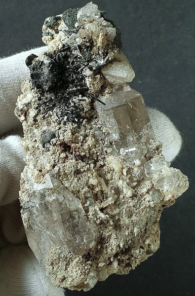 Diese Paragenese-Stufe trägt reichlich nadelige Schörl-Turmaline bis ca. 8 mm, einige matt glänzende Hämatit-Tafeln mit etwas Rutil (bis ca. 10 mm) sowie einen etwas angelösten, doppelendigen Calcit-Skalenoeder (ca. 20 mm)und winzige Adulare. Dazu gehören mehrere recht klare Bergkristalle bis ca. 25 mm. Gewicht: 84 g.