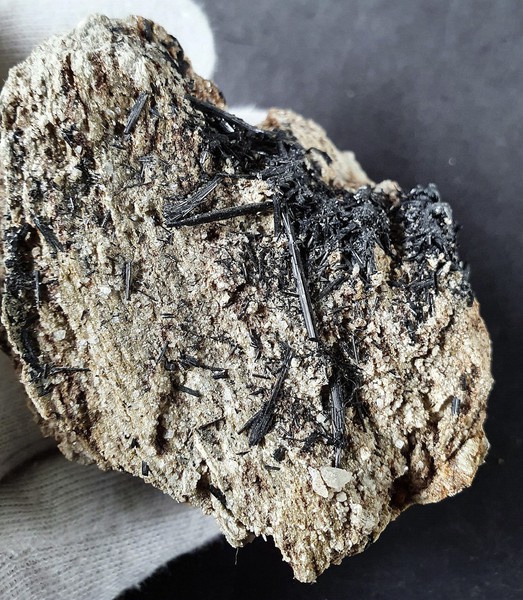 Auf der Matrix sind reichlich glänzende Turmalin-Kristalle (Schörl) gawachsen. Diese sind wirrstrahlig angeordnet und messen bis ca. 15 mm. Dazu gehören winzige Adular-Kristalle. Gewicht: 168 g.