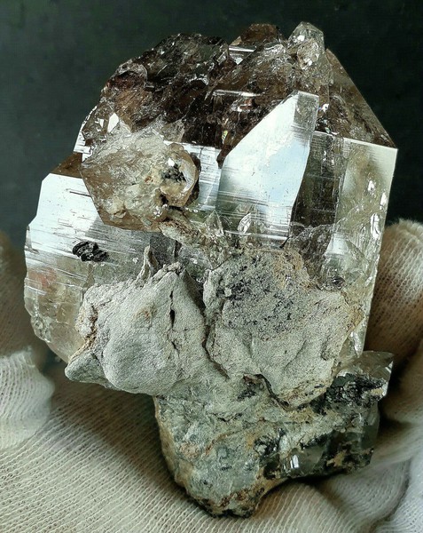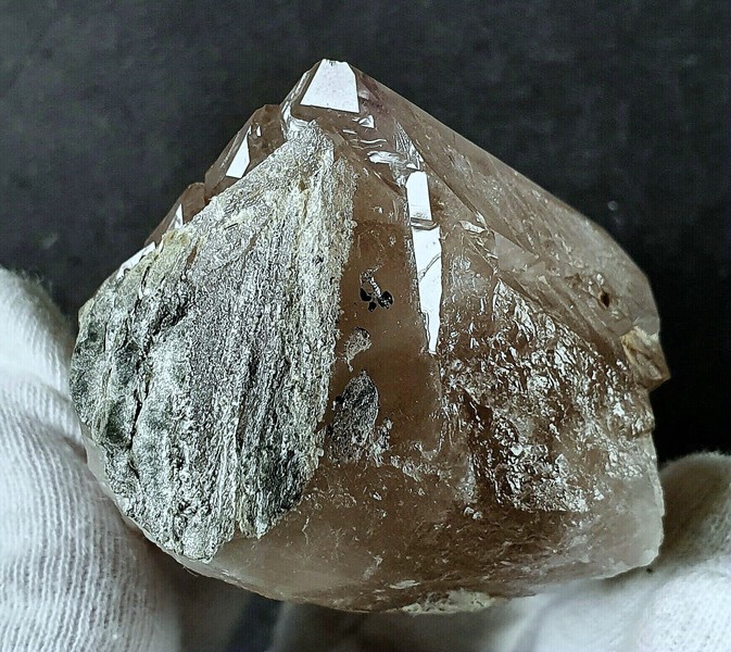 Dieser hochglänzende Rauchquarz-Kristall zeigt mehrere deutliche Abstufungen und eine Zepterung an der Spitze. Zudem gibt es stellenweise Anlösungsstrukturen inclusive Ätzgruben. Am Rauchquarz sind noch einige schiefrige Gesteinsanhaftungen zu sehen. Gewicht: 118 g.