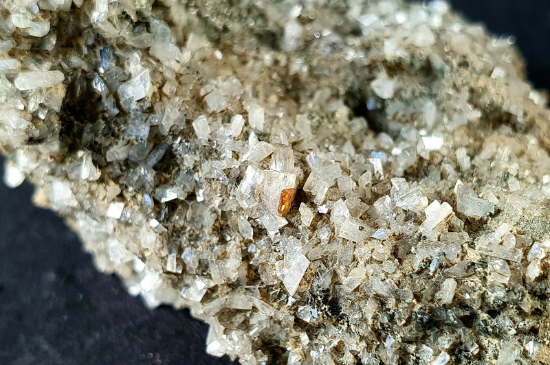 Auf zwei Seiten der Stufe sind rasenartig viele scharfkantige, transparente und hoch-glänzende Adulare bis ca. 4 mm gewachsen. Dazwischen sitzen zwei intensiv orange-farbige und glänzende Monazit - Kristalle von 2 und 1 mm Länge. Gewicht: 84 g.