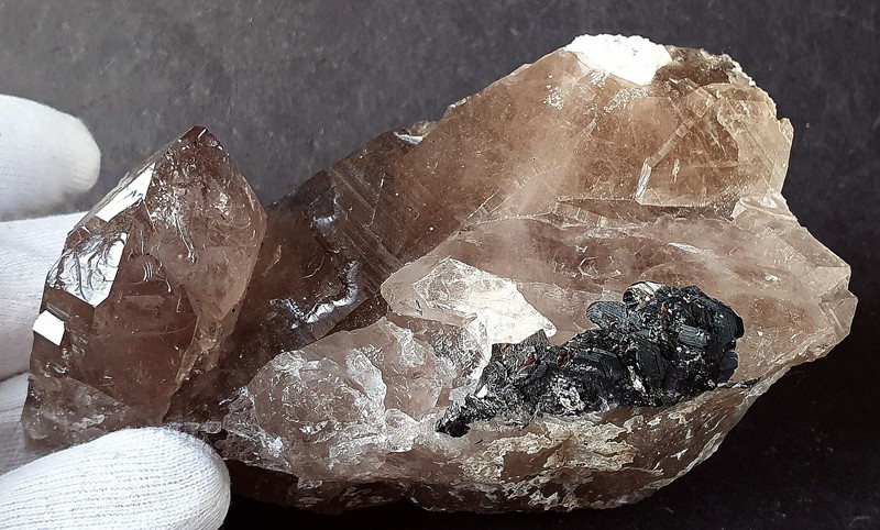 Der helle Rauchquarz hat neben mehreren kristallisierten Flächen auch einen Spitz von ca. 50 mm ausgebildet. Andere Flächen sind Bruchflächen. Die Stufe trägt ein Aggregat (ca. 35 mm) aus mehreren hochglänzenden Hämatit-Kristallen bis ca. 8 mm. darauf gibt es wenige leistenformige Rutile. Gewicht: 316 g.