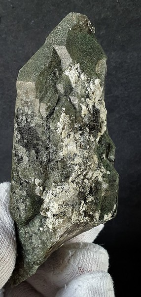 Dieser recht dunkle Rauchquarz zeigt eine abgestufte Spitze sowie auch erkerartige Strukturen. Er hat teils hochglänzende, teils mit Chlorit belegte Flächen. Knapp unter den Oberflächen gibt es reichlich Einschlüsse silbrig glänzenden Chlorits, der teils auch irrisierende Effekte aufweist. Dazu gehören Anhaftungen von Gestein und Feldspat. Gewicht: 184 g.