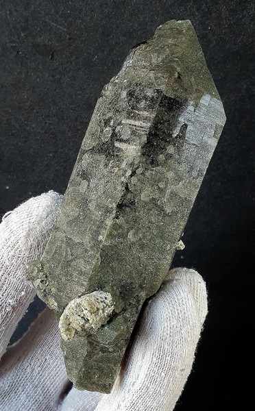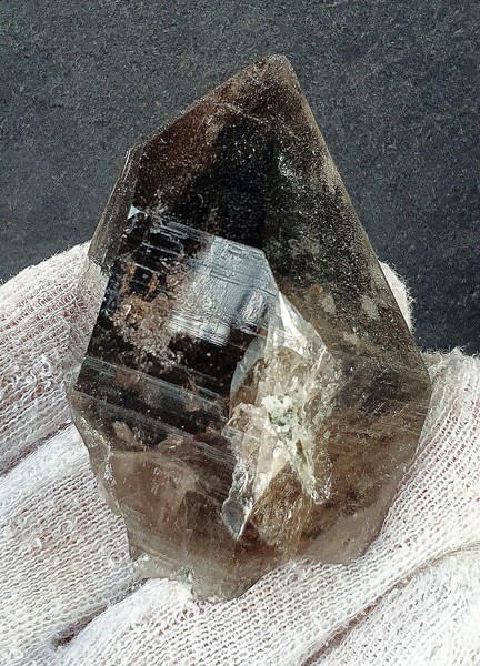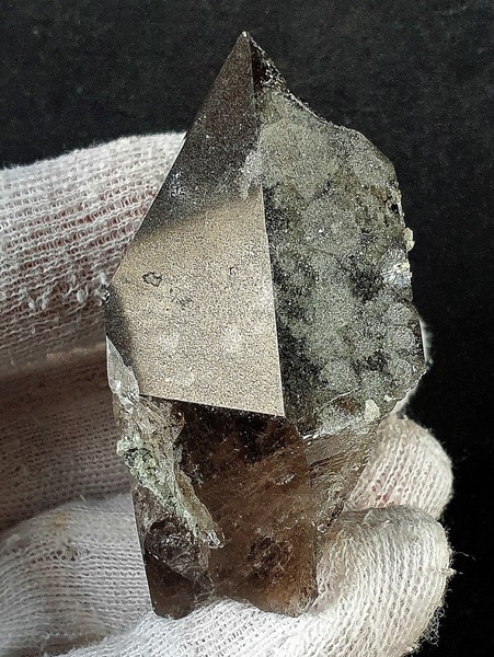 Der schwärzlich dunkle Rauchquarz-Kristall ist im Innern weitgehend klar und zeigt auf einigen Flächen Hochglanz, auf anderen matten Glanz durch feinen Chlorit-Belag. Ein Ende des doppelendigen Rauchquarzes ist rekristallisiert mit mehreren Spitzen. Es gibt außerdem schimmernde verheilte Anwachserstellen und auch eine Partie als Bruchfläche (siehe Bild 6 mittig). Gewicht: 369 g.