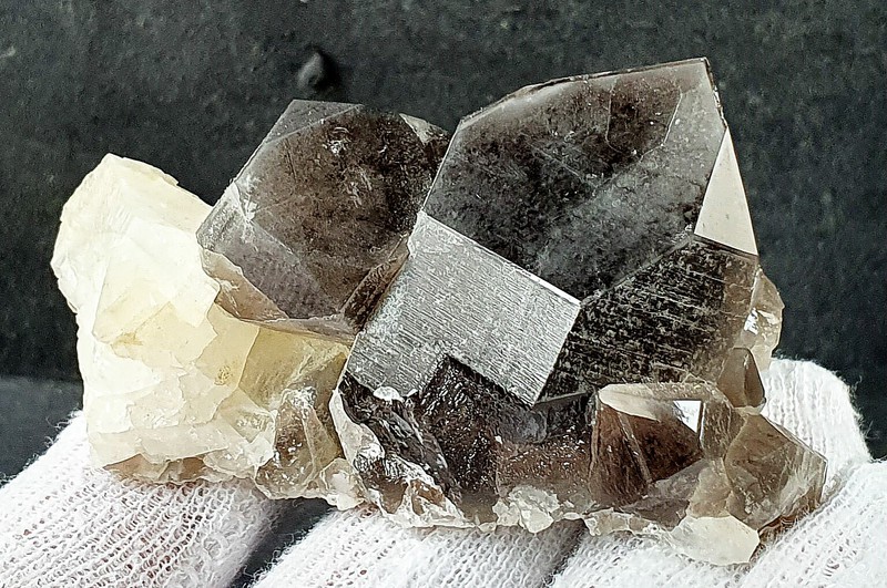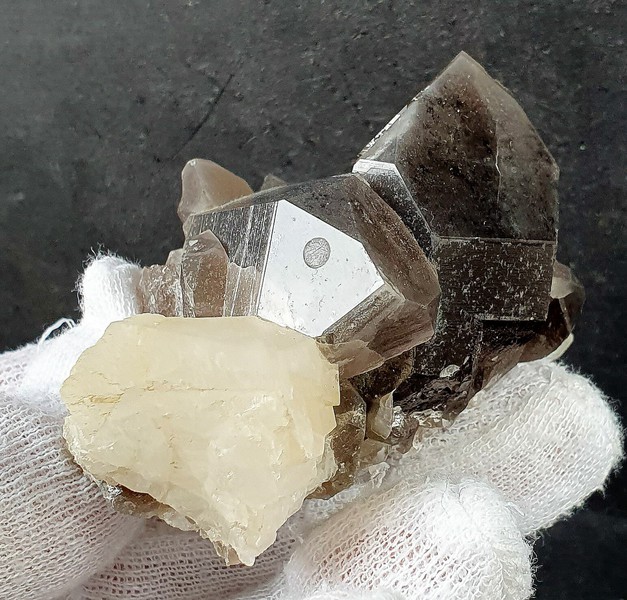 Dieser recht dunkle Rauchquarz ist bals Doppelender ausgebildet und zeigt hohen Glanz auf den Flächen. Dazu gehören seitlich einige Adulare bis ca. 5 mm sowie mehrere kleine Rauchquarze. Gewicht: 145 g.